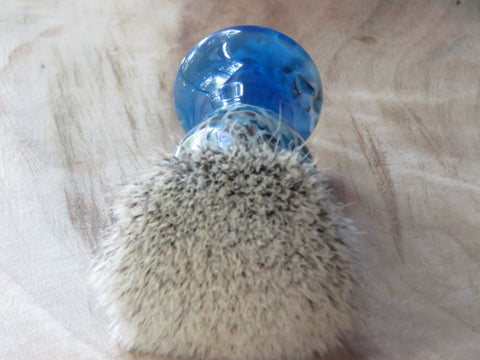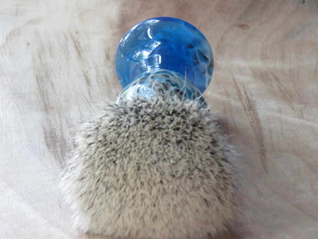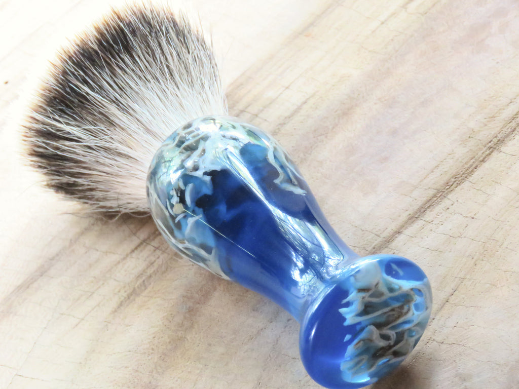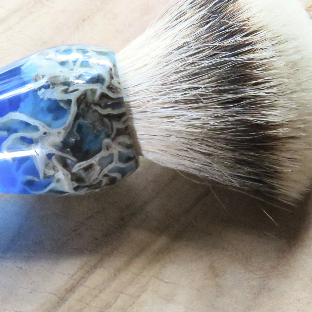 This brush is tall and lanky with some coral in the top and lower ends of the brush, reminding much of a swim-through you may encounter when scuba diving. a Tall brush lather with less effort, and makes me feel like an artist of sorts, more finesse, less grunt. We fitted this handle with a fine looking 26 mm Silvertip badger knot, always a great knot for a long handled brush.