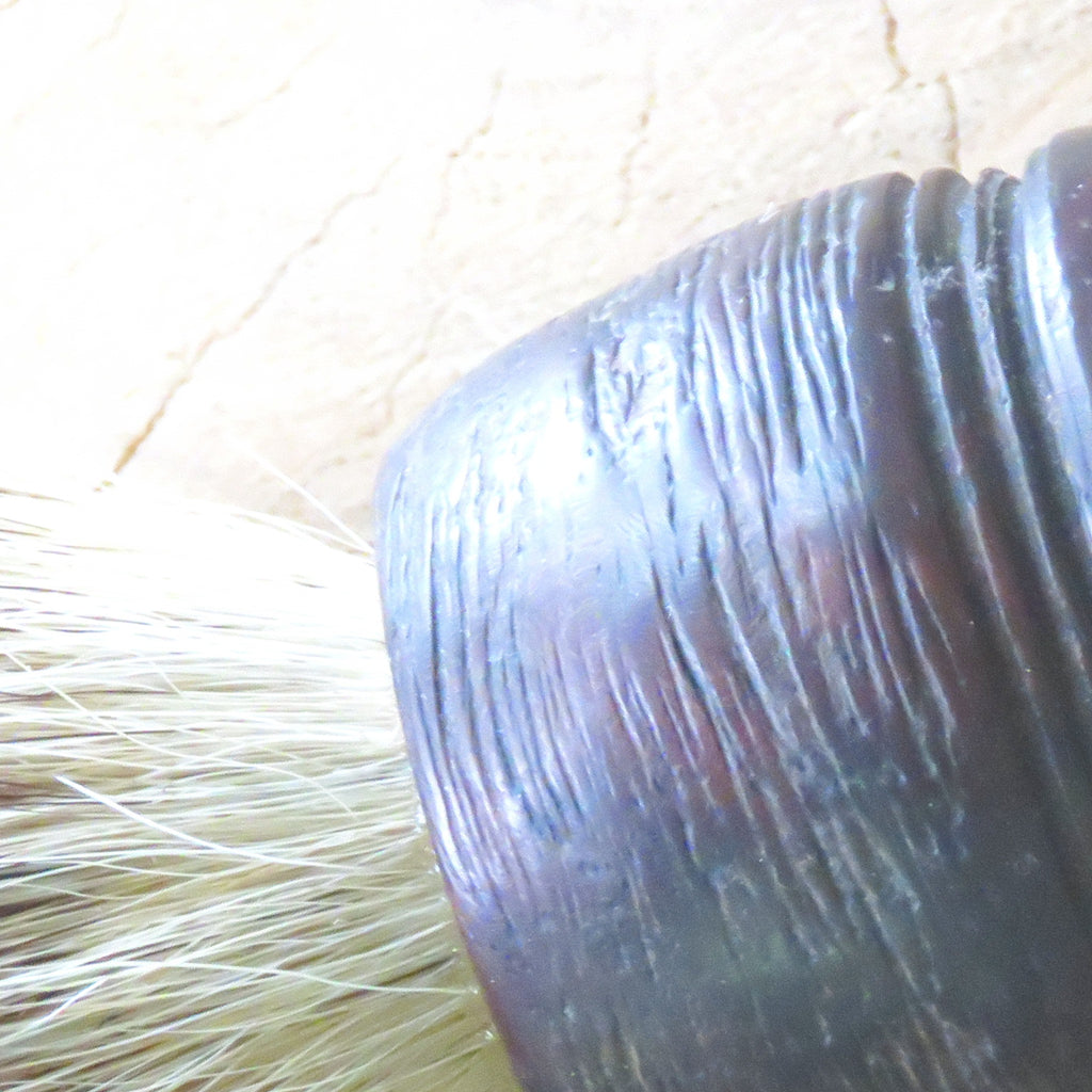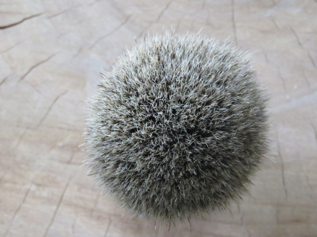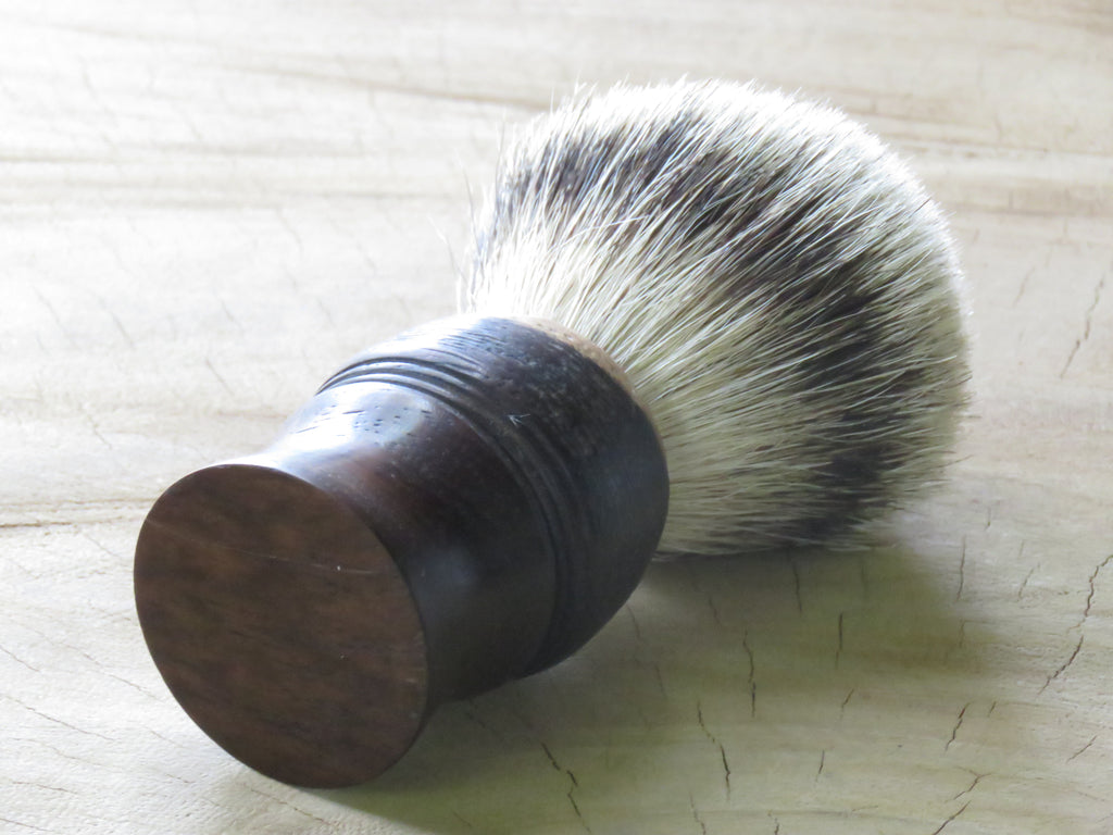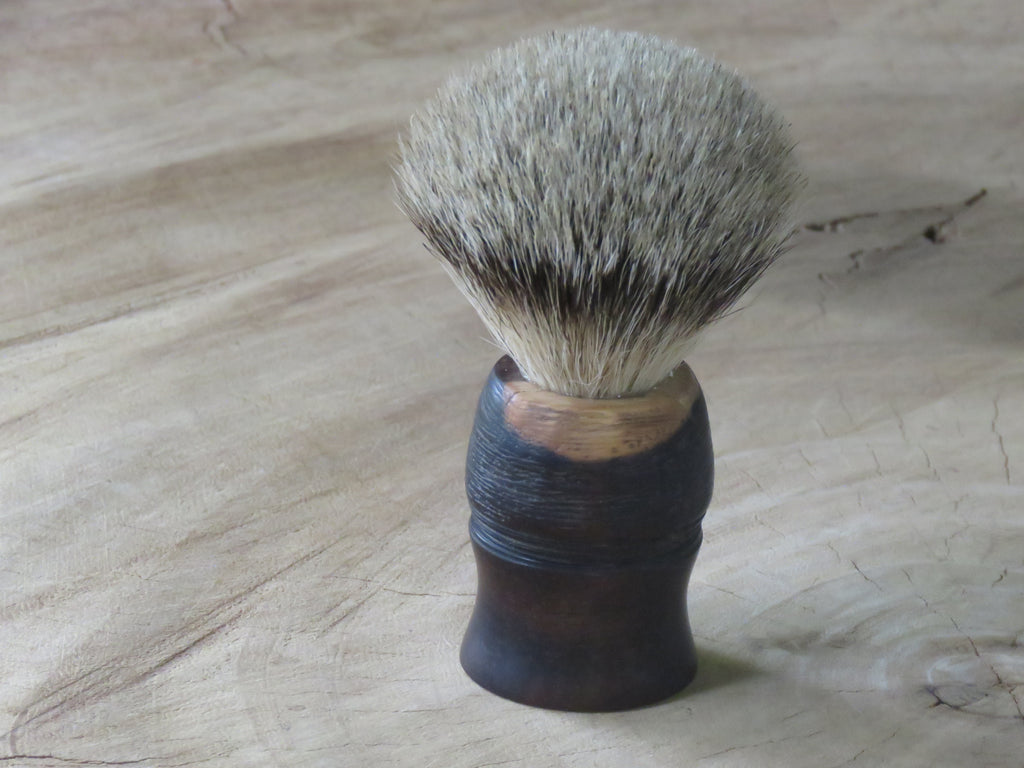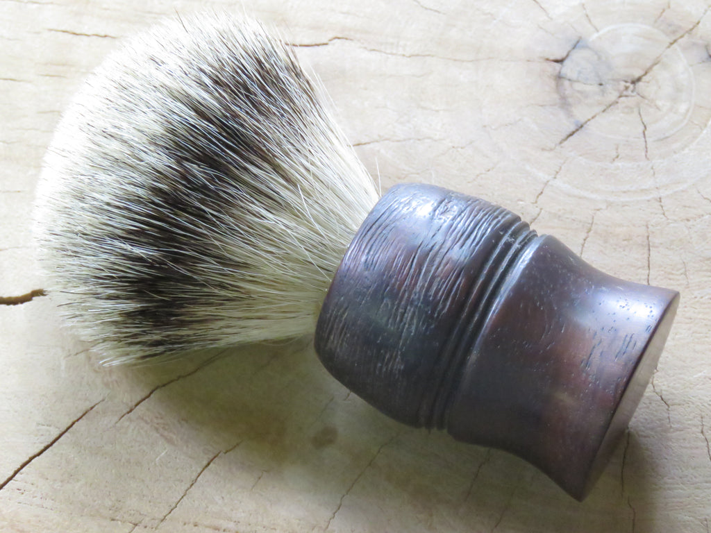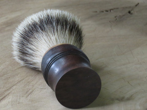 Hardekool is a great wood in that it's grain allows for beaultiful smooth finishing, but just as easily supports texturing and carving, it is a very dense, hard wood and has become part and parcel of the image that pops into our heads the second someone says 'bushveld' This chap is of medium size, but quite 'sturdy' in stature and weight. It is fitted with a 21 mm Super badger knot. Dimensions are 107 mm tall, a loft of 55 mm, and a handle of 39 mm at its widest, and 34 mm at the most narrow diameters. The brush weighs 82 grams.