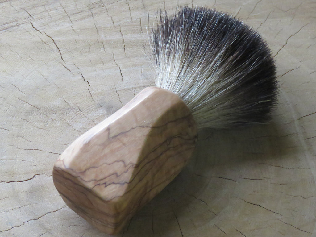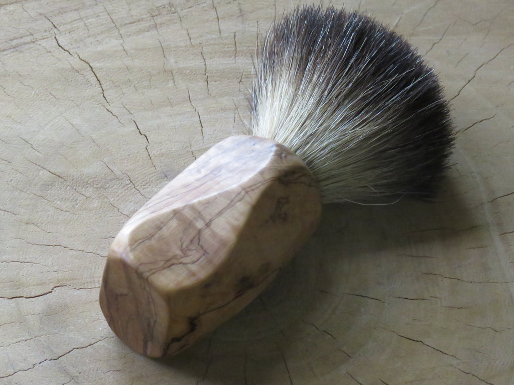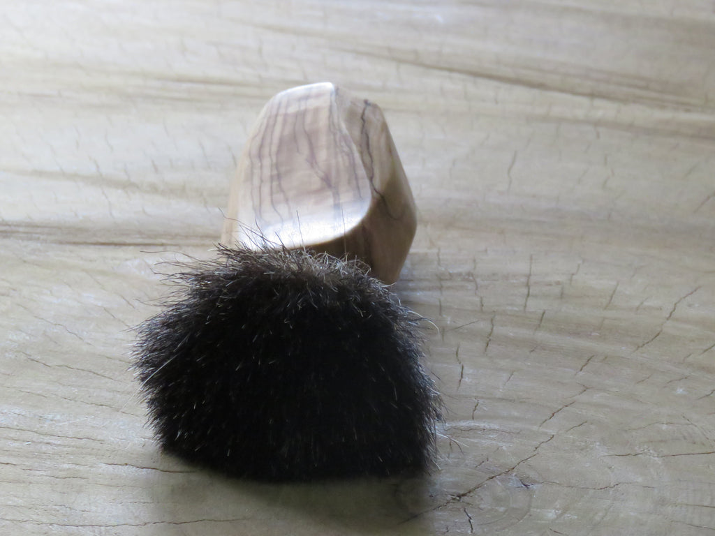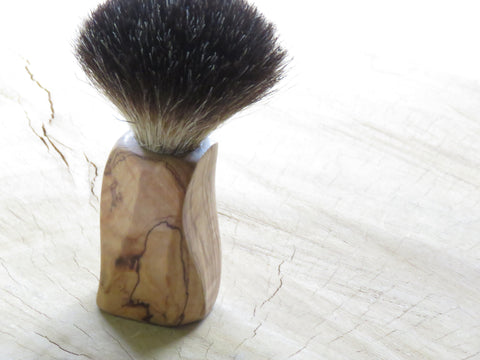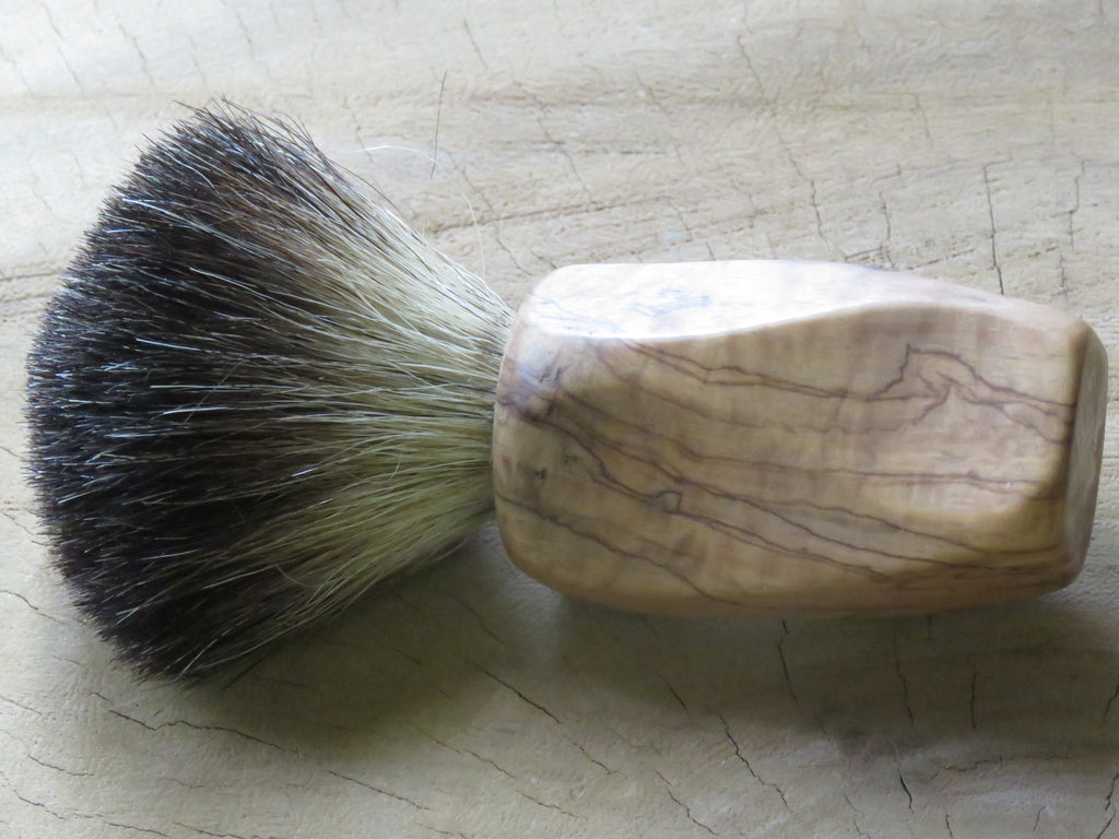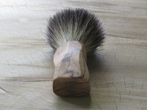 You don't identify as 'normal' is a bit wacky and bend your ways around the norms of society, yes you, this one was made just for your cart! Bushveld wild olive...a few quick slices on the bansaw and a bit of sanding, nothing special, but then again, it stands out from every other citizen that lives in Brushville! It is fitted with a 21 mm Black badger knot. Dimensions are 120 mm tall, a loft of 55 mm, and a handle of 40 mm at its widest, and 33 mm at the most narrow diameters. The brush weighs 90 grams.
