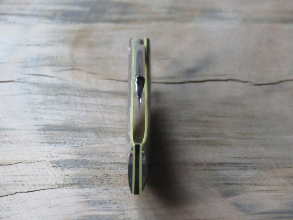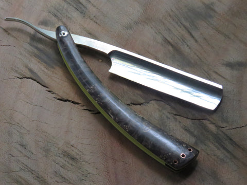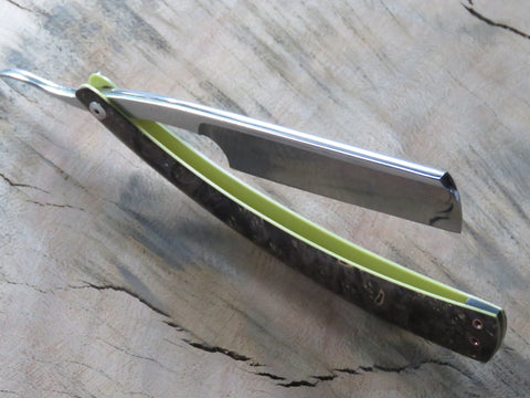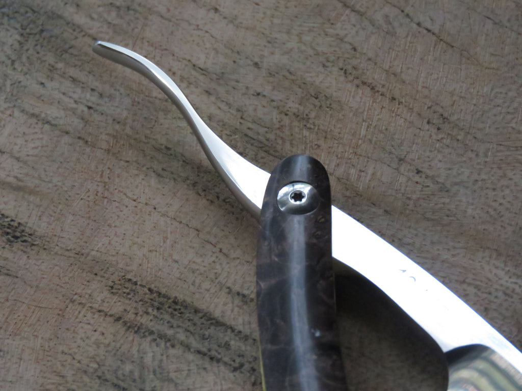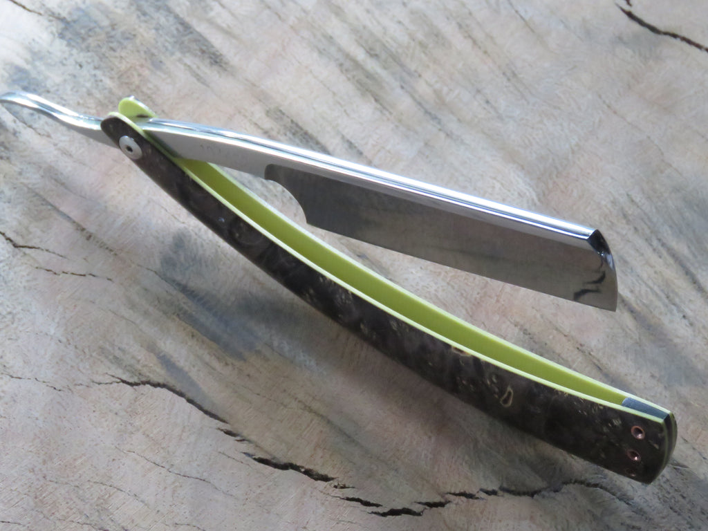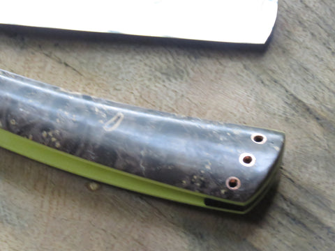 The blade is a half hollow ground RWL34 with a machine finish , the scales are made from dyed and stabilised Japanese Maple burl with yellow G10 liners and hollow copper pins. The wedge is crafted from African Blackwood, and the blade is engraved with 'The Burt' on the one side, and the serial number on the opposite side of the tang. The pivot heads are stainless, and the fitment of them to the T6 Torx holes makes for a sturdy and uniform fit, if floppy blades or scales are a buzz kill for you, this type of fastening will have you smiling from ear to ear.