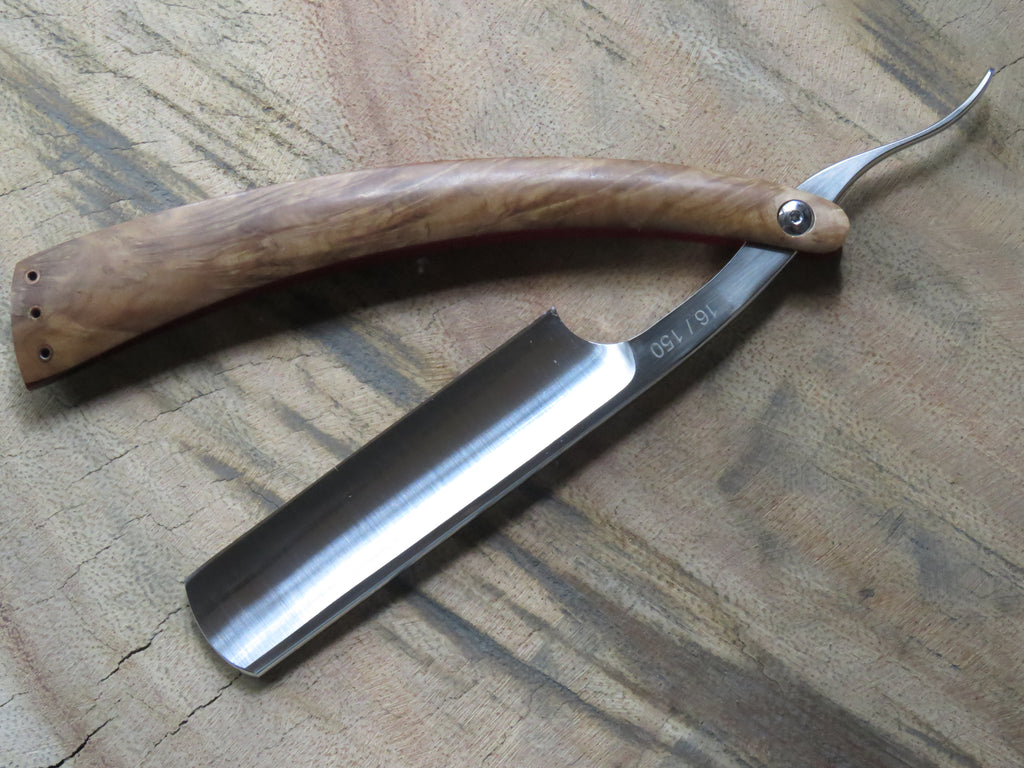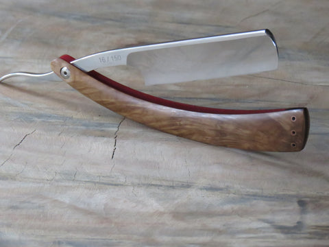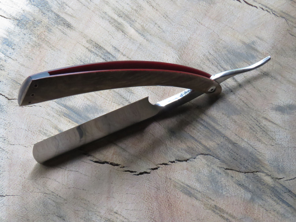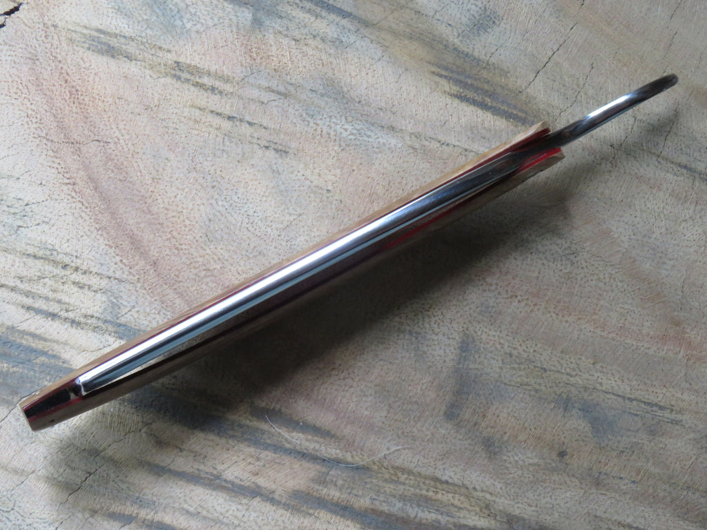 The blade is a half hollow ground RWL34 with a machine finish, the scales are made from dyed and stabilised Birch burl with red G10 liners and hollow copper pins. The wedge is crafted from African Blackwood, and the blade is engraved with 'The Burt' on the one side, and the serial number on the opposite side of the tang. The pivot heads are stainless, and the fitment of them to the T6 Torx holes makes for a sturdy and uniform fit, if floppy blades or scales are a buzz kill for you, this type of fastening will have you smile from ear to ear.