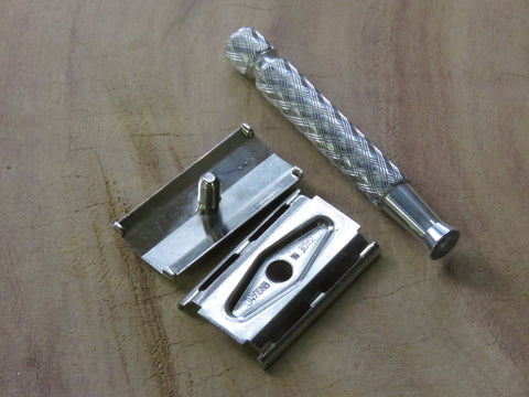 The British made Gillette Tech Alu-handle is a very light aluminium handled razor that was made for around 10 to 15 years in the 60's and 70's, although they were quite popular locally, they seem to be quite hard to get one's hands on. The handles are made of aluminium alloy, they tend to flare open over time when tightened to much, so watch out for that when using this razor or buying a used one. This one's handle is still perfect.