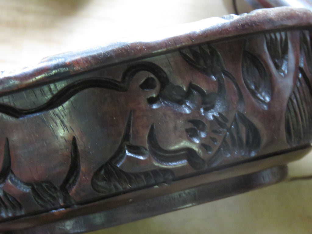 We love African wood species and if a product is made by local crafts persons it is all that more special to us. This bowl is made from Black Ivory (Mpingo) a very scarce wood with a naturally high oil content, it is a much sought after wood for blow instruments like clarinets, favored for its stability and beautiful appearance. We have enquired about the source of the wood and were informed its from an area where they cultivate the tree in a sustainable manner, as Malawi is not around the corner we could not pop in and verify this, but we will be making some more enquiries and are doing our best to make sure all timber we use is sourced sustainably. Each piece is made with basic tools and then carved by hand, some imperfections might be present on the bowl, but we'd much rather see this valuable resource used in every possible way and get it in your hands, than insist on spotless, very expensive creations. There are two beasties on either side of the bowl, usually a different animal.