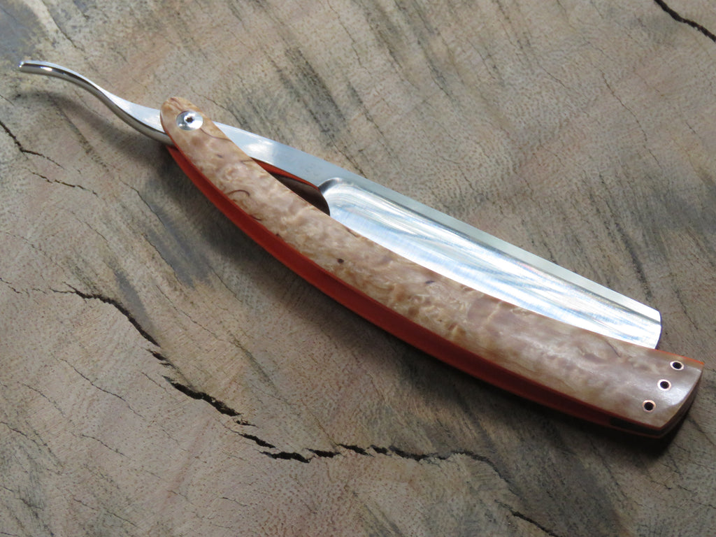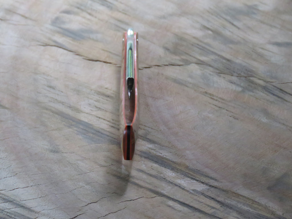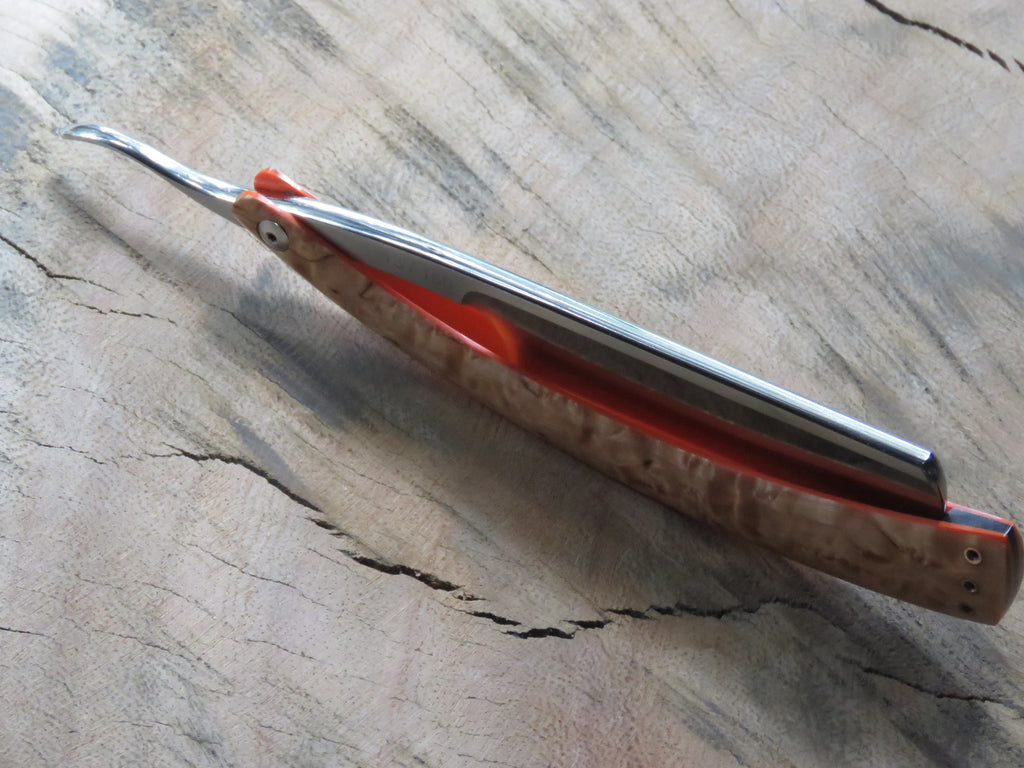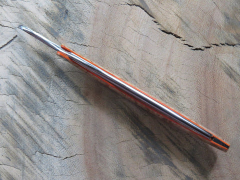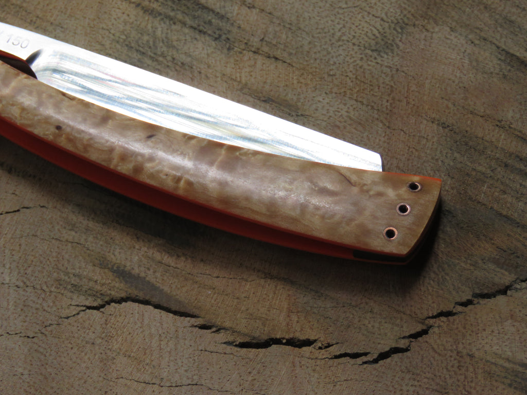 The blade is a half hollow ground RWL34 with a machine finish , the scales are made from dyed and stabilised Maple burl with orange G10 liners and hollow copper pins. The wedge is crafted from African Blackwood, and the blade is engraved with 'The Burt' on the one side, and the serial number on the opposite side of the tang. The pivot heads are stainless, and the fitment of them to the T6 Torx holes makes for a sturdy and uniform fit, if floppy blades or scales are a buzz kill for you, this type of fastening will have you smiling from ear to ear.