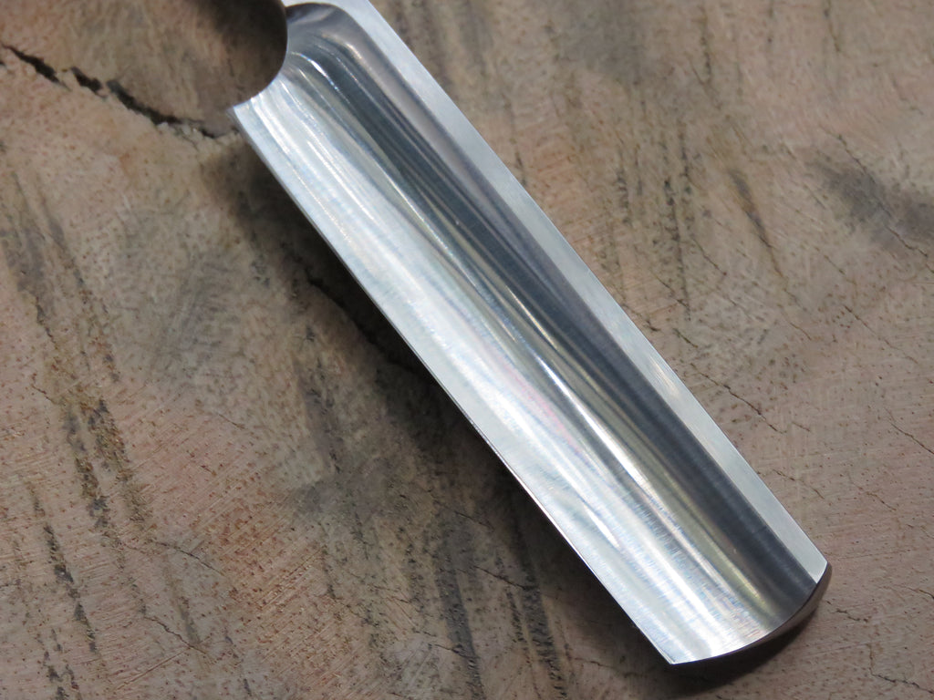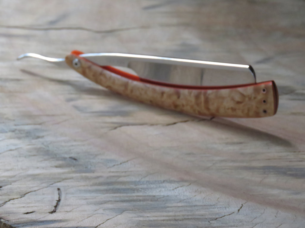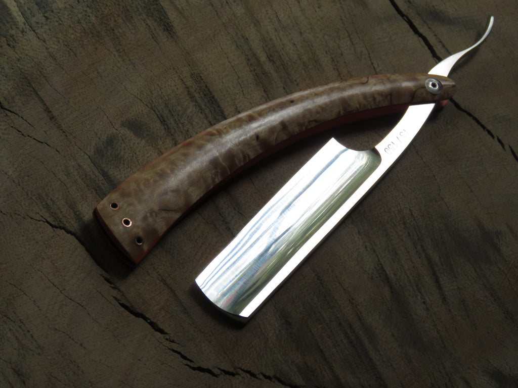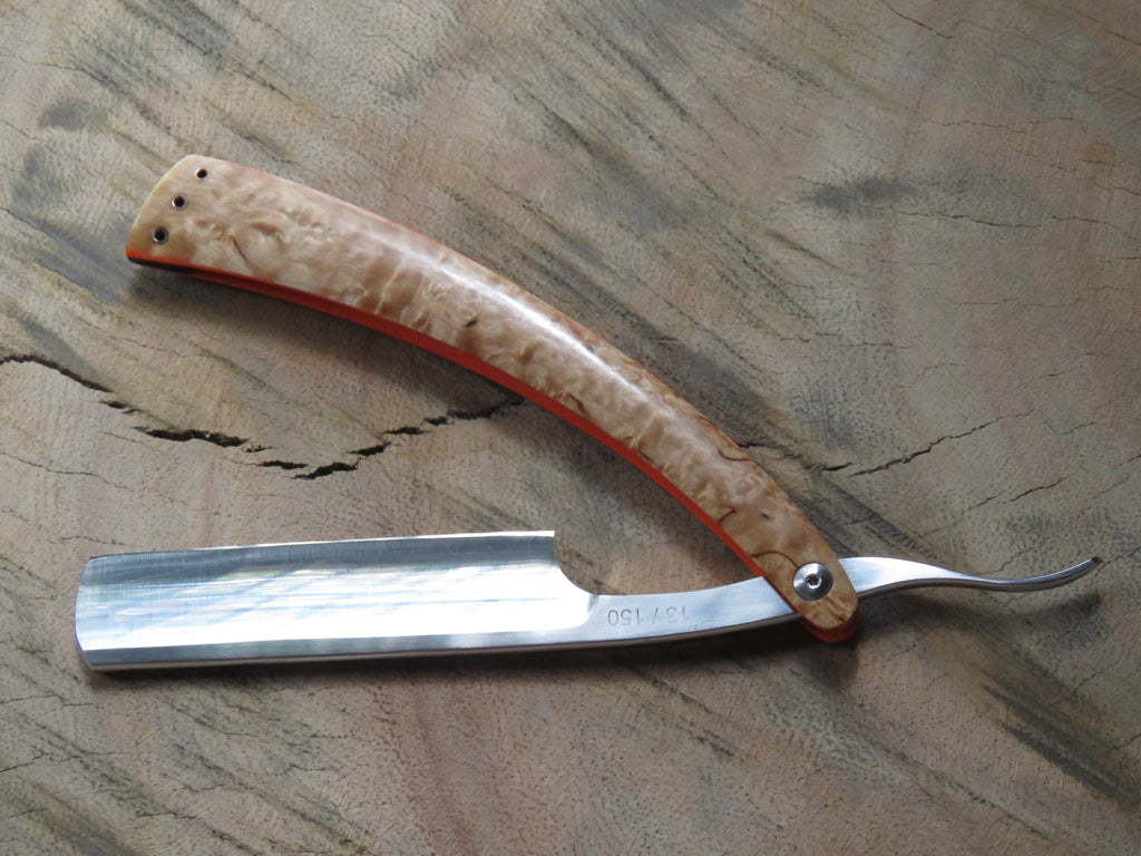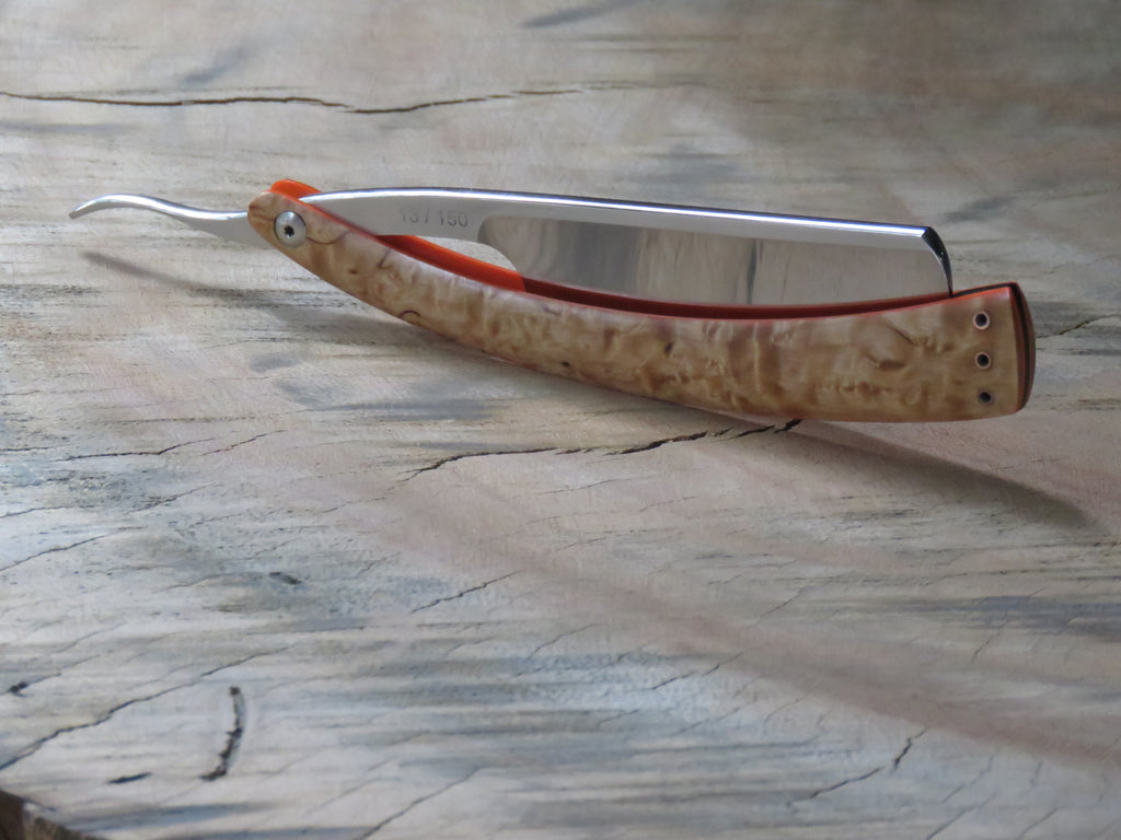 The blade is a half hollow ground RWL34 with a machine finish , the scales are made from dyed and stabilised Maple burl with orange G10 liners and hollow copper pins. The wedge is crafted from African Blackwood, and the blade is engraved with 'The Burt' on the one side, and the serial number on the opposite side of the tang. The pivot heads are stainless, and the fitment of them to the T6 Torx holes makes for a sturdy and uniform fit, if floppy blades or scales are a buzz kill for you, this type of fastening will have you smiling from ear to ear.
